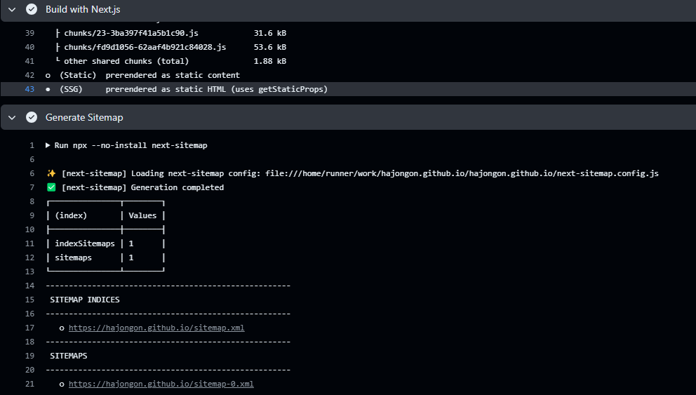 yml- name: Generate Sitemap run: ${{ steps.detect-package-manager.outputs.runner }} next-sitemap && cp -r ./public/sitemap*.xml ./out/
